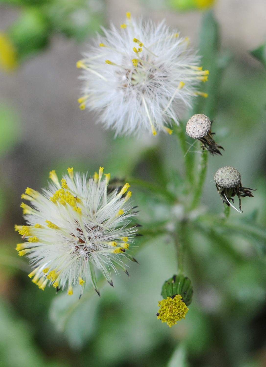 Les fleurs, en forme de tube, ne s’ouvrent pas. Les étamines et les pistils, parties fertiles des fleurs, se situent dans la zone jaune des inflorescences appelées capitules. La photo ci-contre montre des fleurs qui se transforment en fruits, munis d’aigrettes blanches qui assurent leur dissémination par le vent. A droite, les organes blanchâtres en forme de balles de golf sont les réceptacles floraux de fleurs qui ont terminé leur existence : les fruits ont été dispersés, les petits trous sont les cicatrices de l’insertion des fruits. | ![]() |