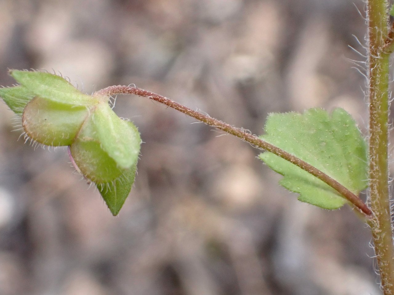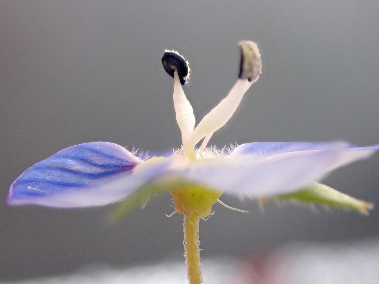 La fleur aux quatre pétales d’un bleu intense arbore deux étamines dressées marquées de noir dont l’une masque en partie le style. Ces éléments identifient la Véronique de Perse.