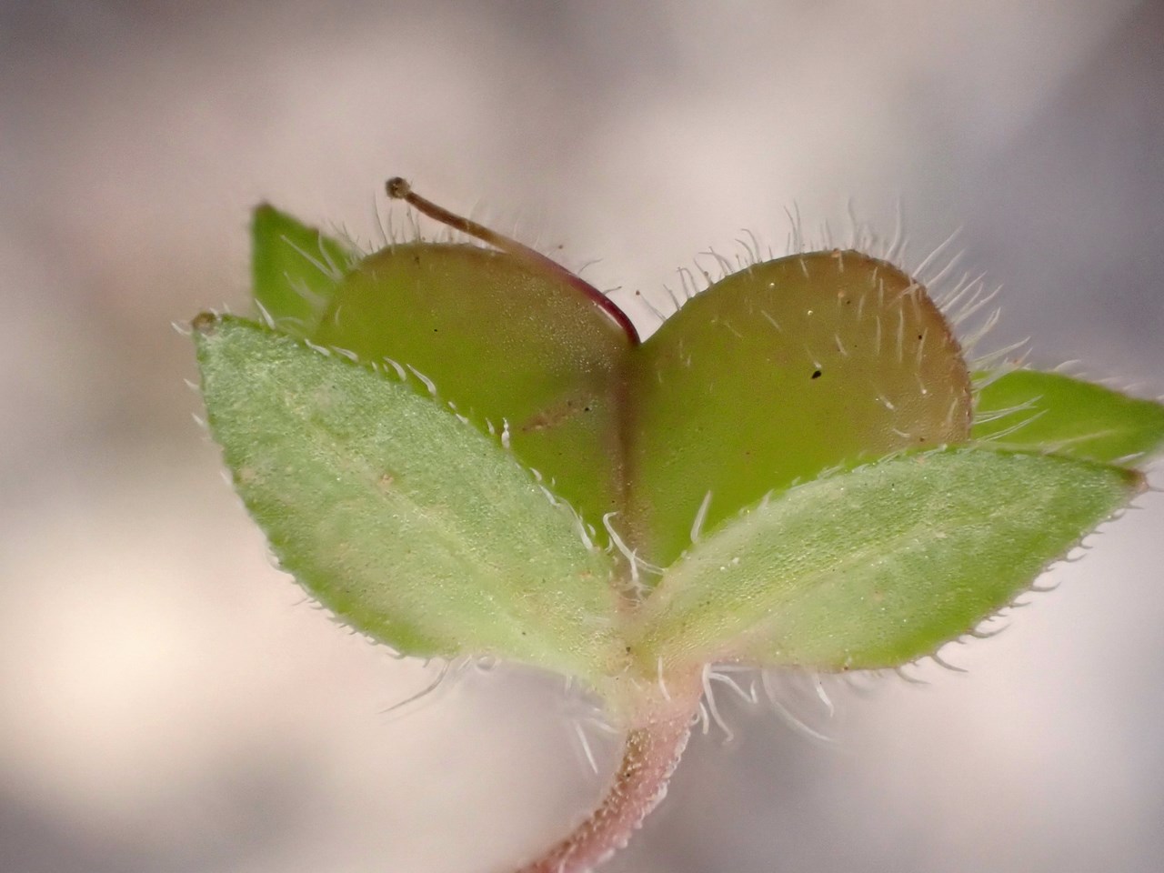 La tige est à droite, verticale. Elle porte un pédoncule à l’extrémité duquel les quatre sépales entourent un organe à deux lobes, l’ovaire de la fleur qui devient fruit. Le filament qui émerge est le style terminé par le stigmate.