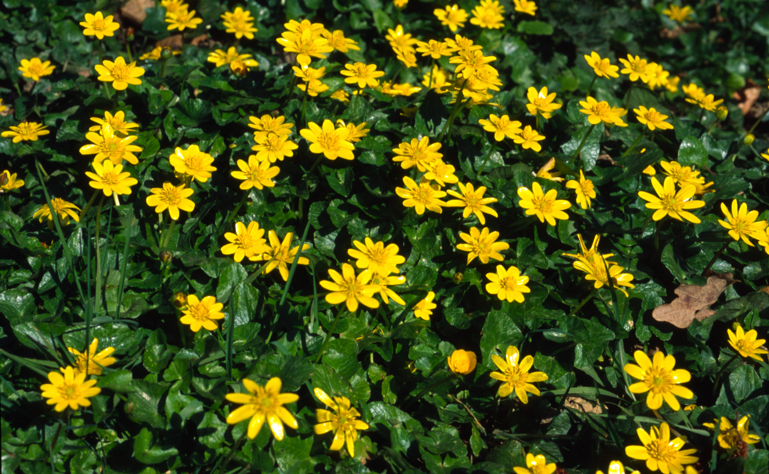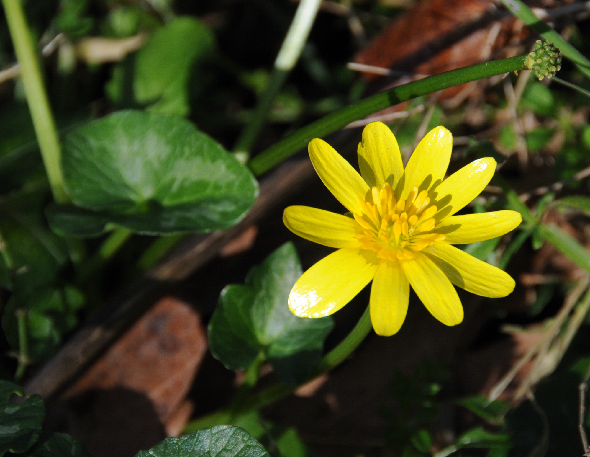 Sur les pelouses, une sorte de Bouton d’or démarre sa floraison en ordre dispersé, la Ficaire. Comme le premier nommé, c’est une Renoncule mais nettement moins haute. Les feuilles étaient réputées comestibles autrefois, mais avant la floraison car ensuite, elles deviennent toxiques ! C’est sans doute la raison pour laquelle son usage est tombé dans l’oubli. Il lui reste son aspect esthétique, surtout quand elle arrive à conquérir une surface assez vaste, un peu plus tard en saison.