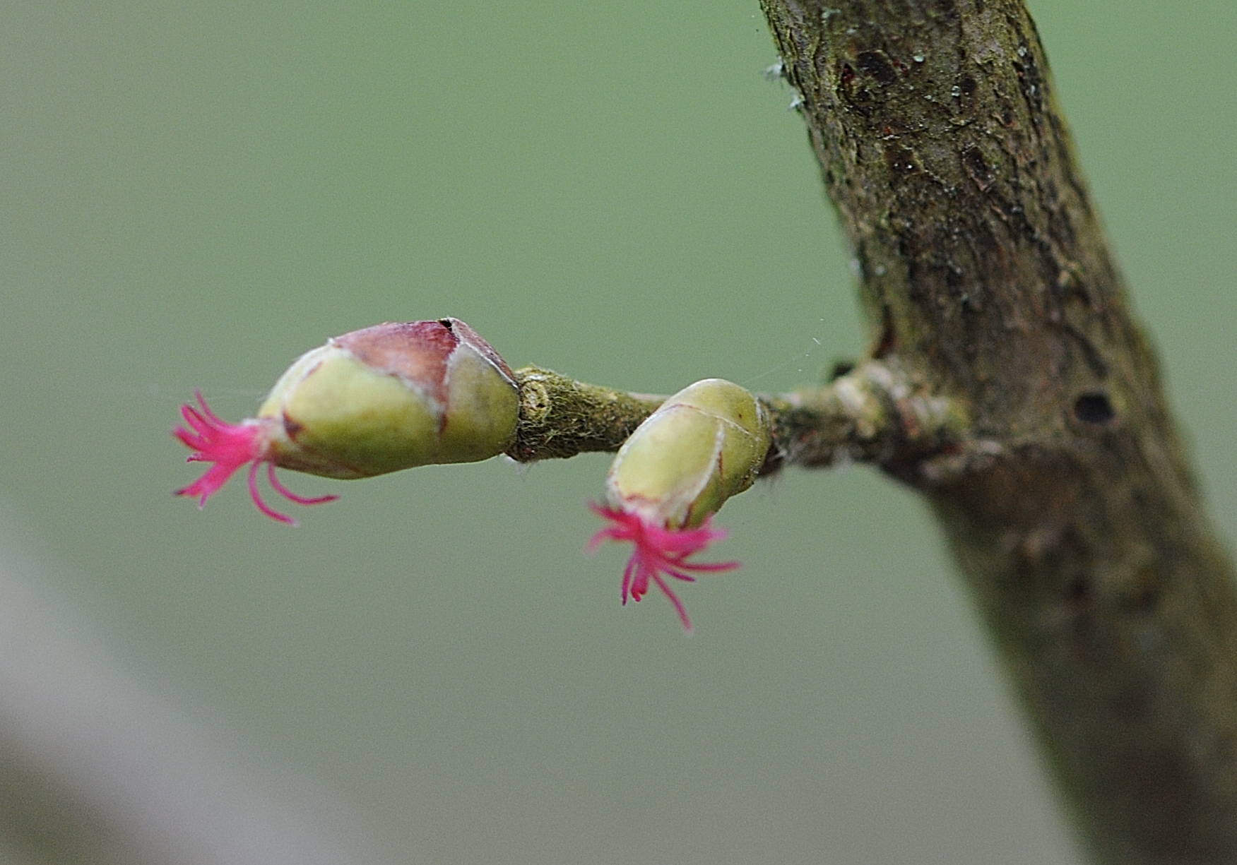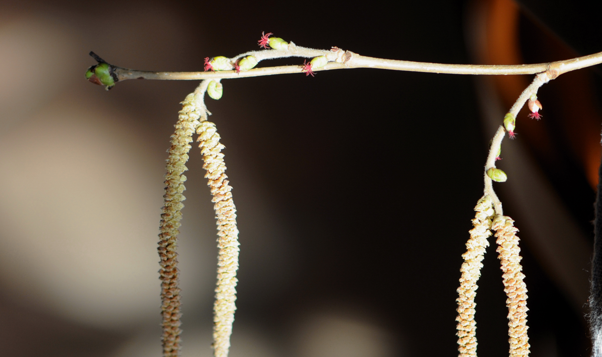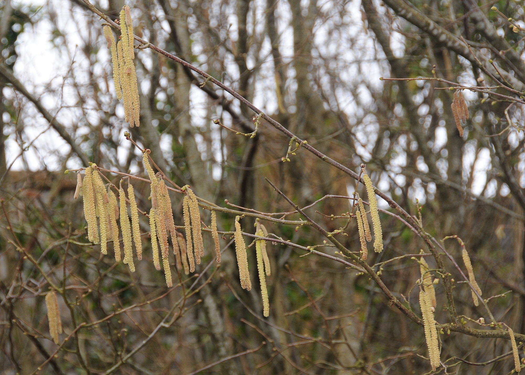 Le Noisetier lui aussi entame sa floraison, mais, prudent, il préfère confier au vent plutôt qu’aux insectes son précieux pollen. Les organes jaunâtres, pendants, sont les inflorescences mâles dont les  étamines produisent un nombre phénoménal de grains de pollen. A maturité, ils s’envolent à la moindre risée sous la forme d’une poussière jaune. Chaque grain a une probabilité extrêmement faible de se coller sur un stigmate femelle rouge (fleurs mâles et femelles d’un même arbuste n’arrivent pas à maturité en même temps) mais ils sont tellement nombreux que la pollinisation réussit et que nous pouvons, quelques mois plus tard,  déguster des noisettes !