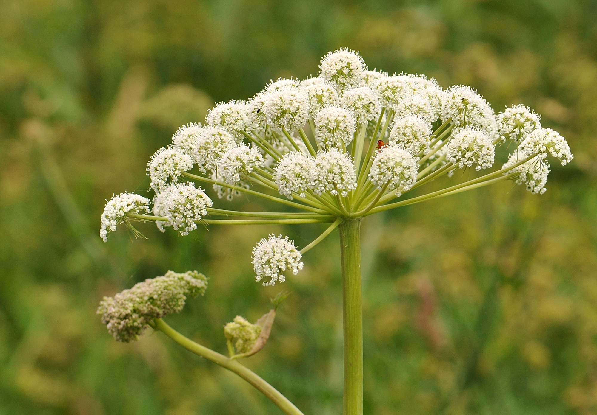 Ci-dessous, l’inflorescence de l’Oenanthe safranée, plus globuleuse, plus sphérique que celle de l’Angélique des estuaires.