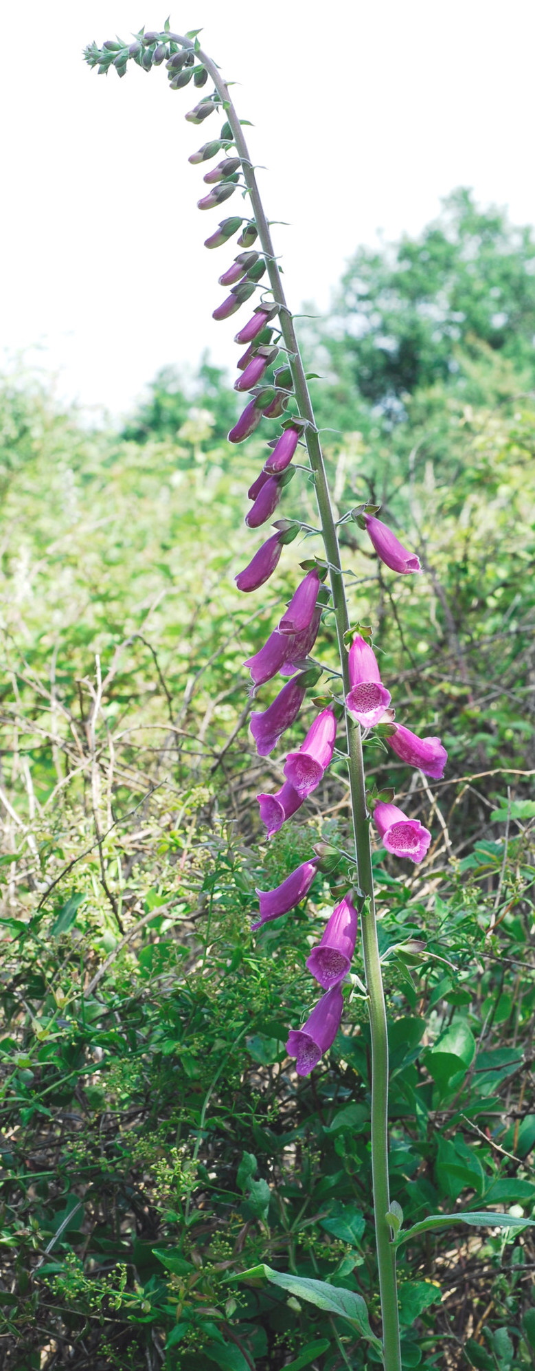 Les pétales soudés donnent à la fleur un aspect tubulaire d’où les noms vernaculaires de la plante : Dé de couleuvre, Gants de la Vierge… Son nom « officiel », Digitale, est de la même veine.