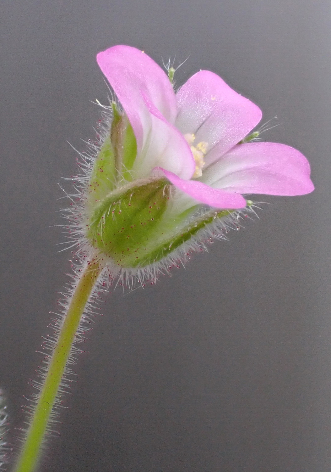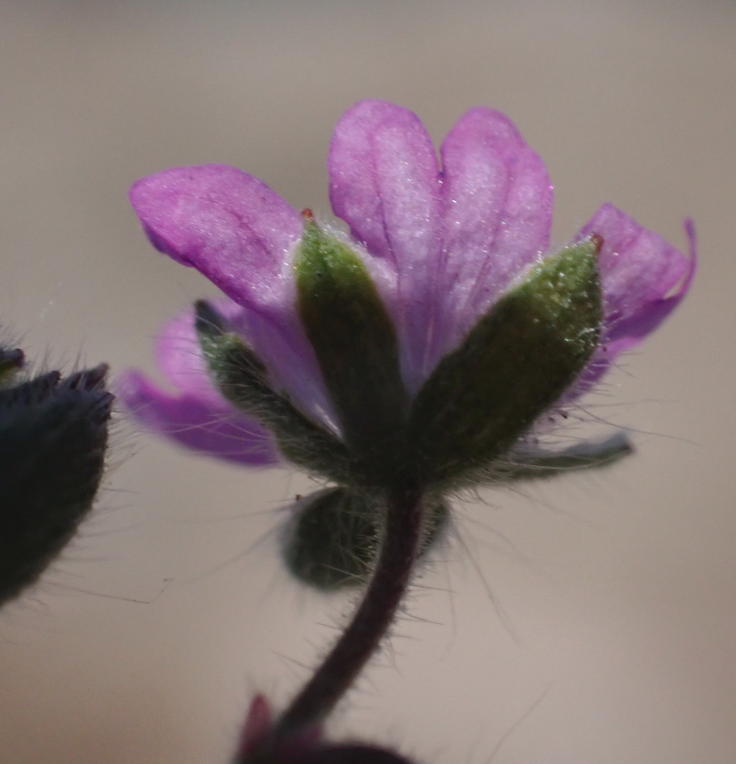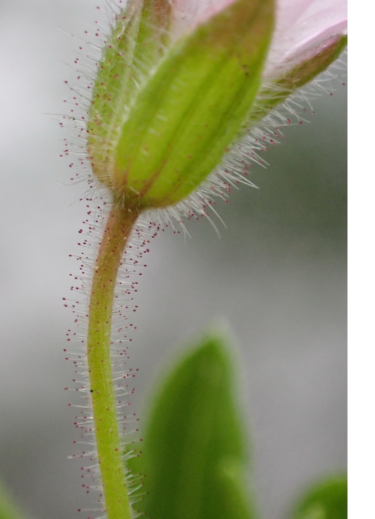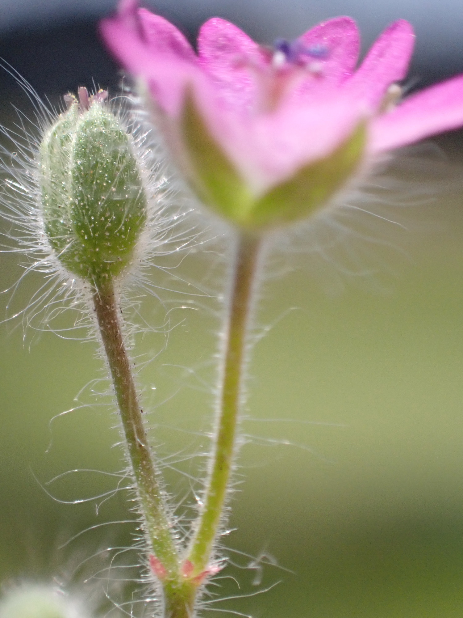 Le Geranium à feuilles rondes porte des poils glanduleux, à peu près tous de même taille. La « glande » de chaque poil apparaît comme une minuscule bille rouge à son extrémité.