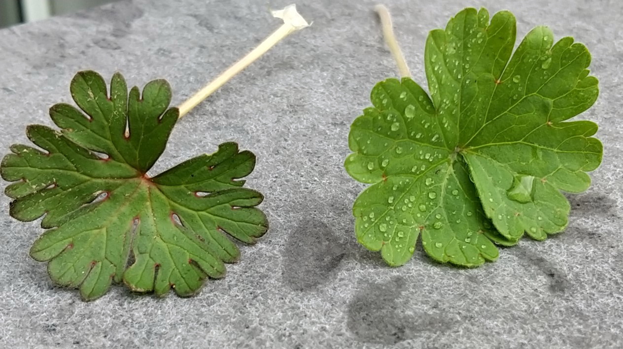 Noter la taille des lobes plus découpés et le rougissement des bordures et des coins chez le Geranium à feuilles rondes.