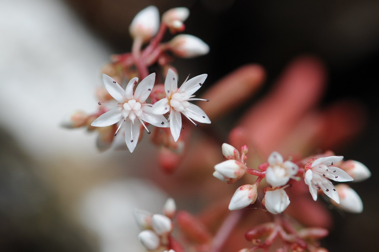 Bien qu’il soit qualifié de blanc, il apparaît globalement rougeâtre par ses feuilles, vertes mais aussi rouges. Elles sont cylindriques, charnues et montrent clairement que l’on a affaire à une plante grasse (famille des Crassulacées).