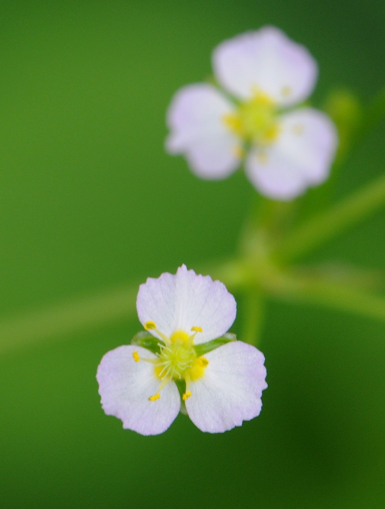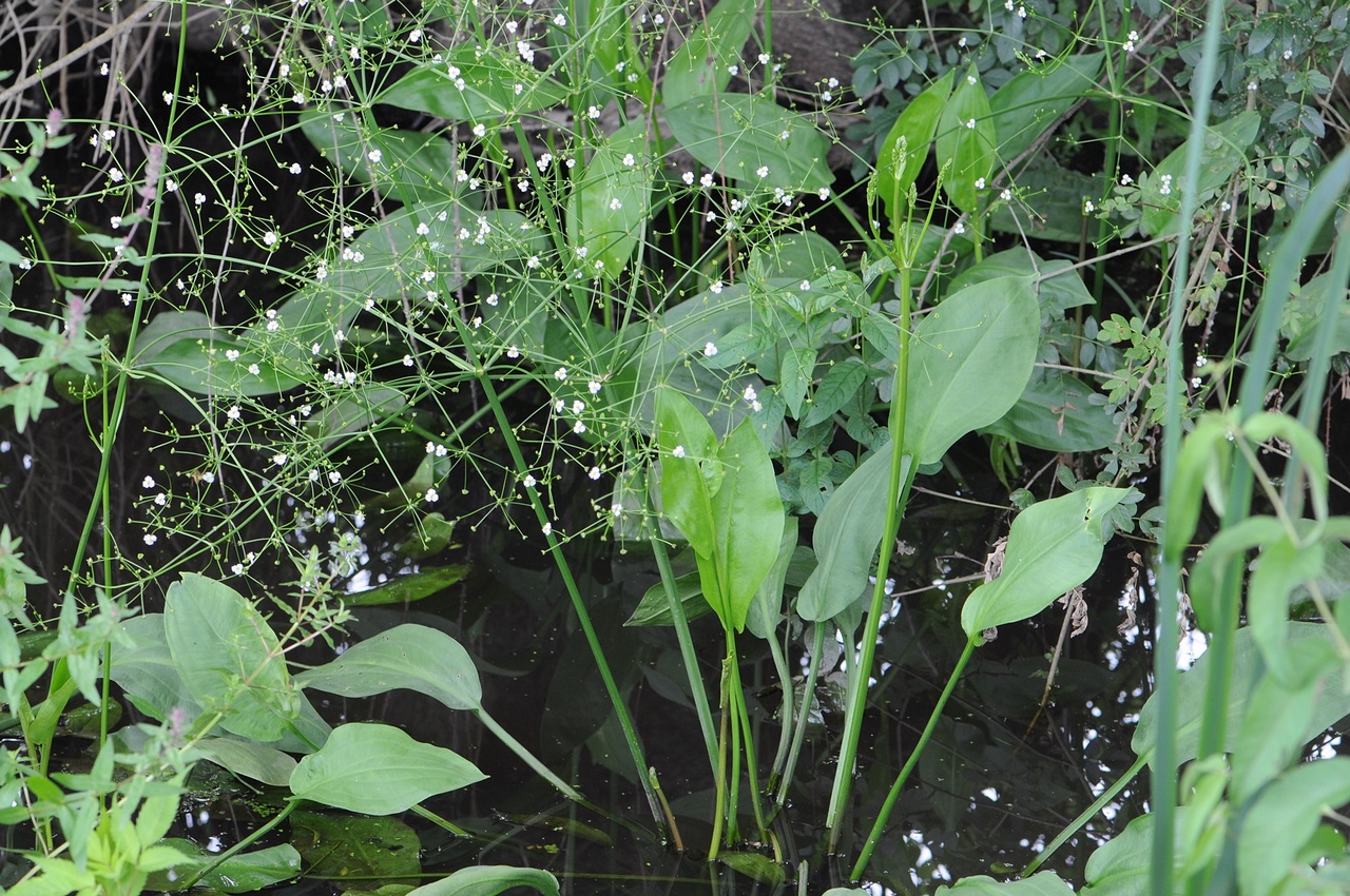 Les fleurs, très petites, blanches légèrement rosées, sont organisées en une inflorescence très ramifiée et peu dense. Les feuilles, dont le pétiole émerge de l’eau, sont lancéolées, ce qui leur donne un faux-air de plantain, mais la parenté s’arrête là.