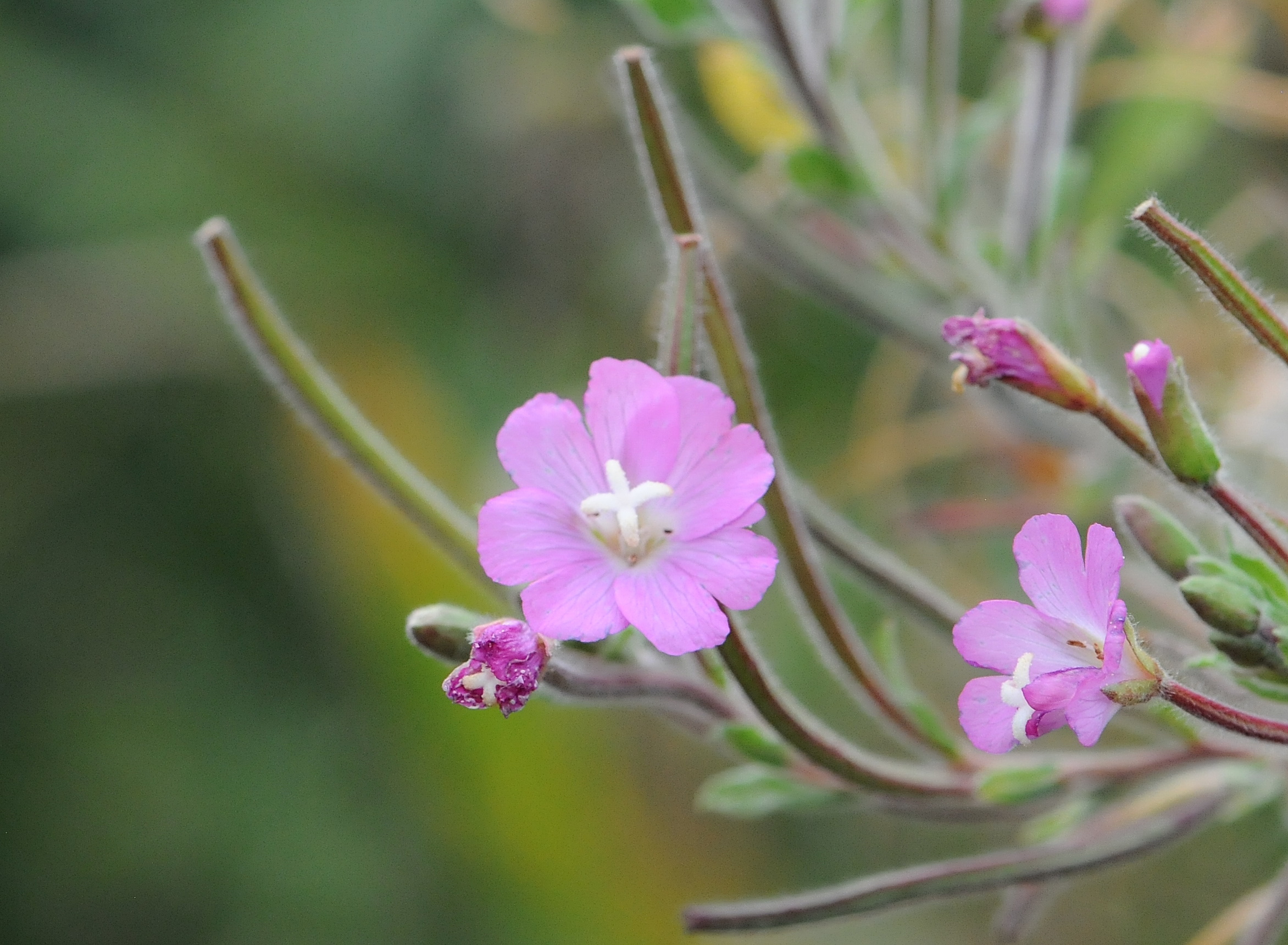 Les fleurs, d’un beau rose pourpré, sont grandes (2 cm), avec quatre pétales échancrés. Elles arborent en leur centre un stigmate à quatre lobes.