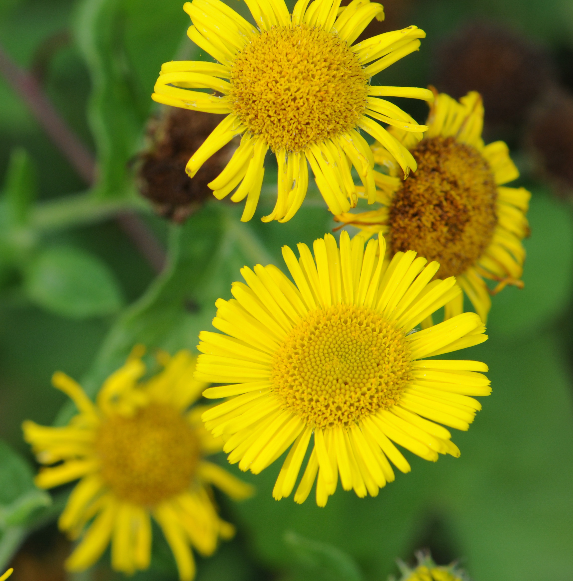 Lieux humides, fossés, bords des mares et étangs, la Pulicaire dysentérique forme des colonies denses partout. C’est une plante de la famille de la Pâquerette dont les inflorescences sont d’un beau jaune vif, aussi bien les fleurs centrales fertiles que les languettes périphériques stériles. Les feuilles sont molles, chiffonnées, légèrement odorantes quand on les froisse.