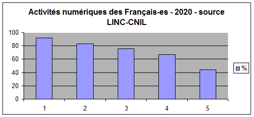 ![]() | 1 : internaute 2 : se connecte tous les jours 3 : a effectué au moins un achat en ligne au cours des douze derniers mois 4 : a participé à des réseaux sociaux au cours des douze derniers mois 5 : a vendu des biens ou des services sur internet au cours des douze derniers mois |